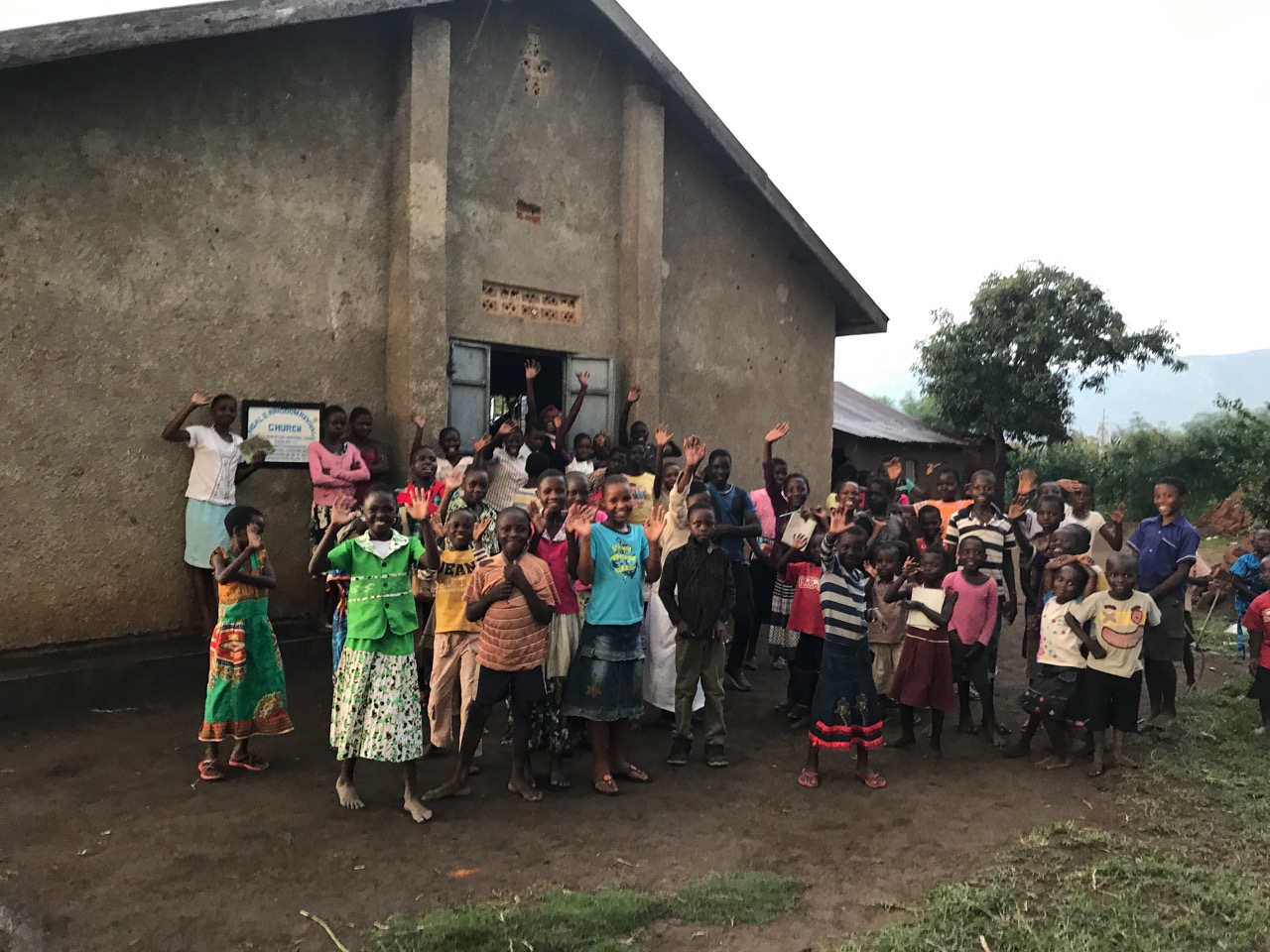 My group went to Mbale Kingdom Revival Church. We walked in the door and were greeted (quite unexpectedly) by clapping and cheers. There must have been 250 kids in the packed into the single room church. We each introduced ourselves, taught them Father Abraham, complete with crazy dance moves, and learned a song from them … with similar crazy dance moves. When we were getting ready to leave, I asked if I could take a picture, and the kids started pouring out of the church to wave to us. Check this out…