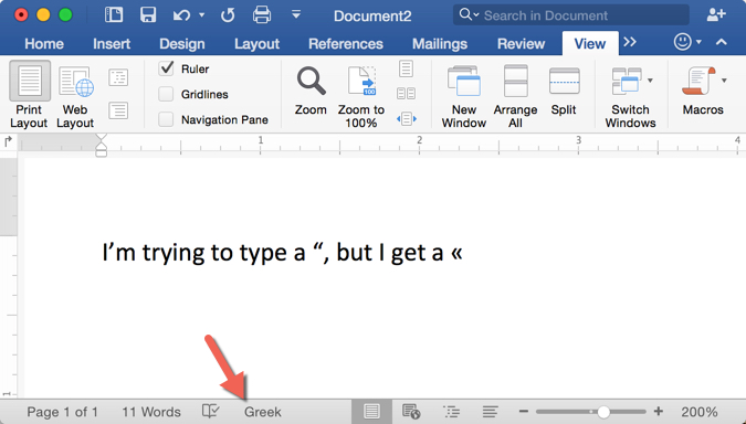 under correctly-spelled words (see about), but also when I type a double quote (“), I get a funky double arrow character (« or »). If this happens, look at the language indicator for that part of the text, and it will likely show “Greek” when you’re trying to work in English. Just change it (click on “Greek” in the bottom bar, and select “English (US)”, then retype your quote mark.