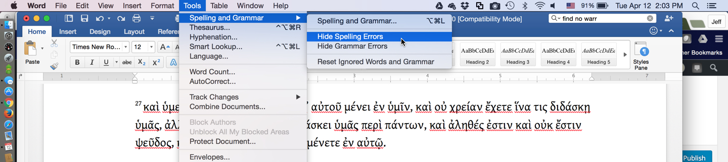 Hide Spelling Errors: Word helpfully underlines all your lovely Greek text with red squiggly lines indicating that it is an incorrectly spelled English word. That’s pretty annoying. The good news is that you can easily turn this off. Select “Tools” in the menu (NOT the ribbon, the menu), then “Spelling and Grammar” (first item), then check “Hide Spelling Errors”. This will only work for the current document, but it will send the unhelpful red squiggles out where there is weeping and gnashing of teeth.